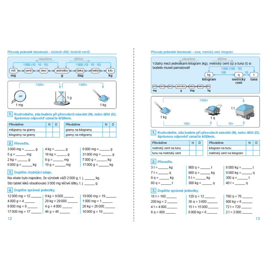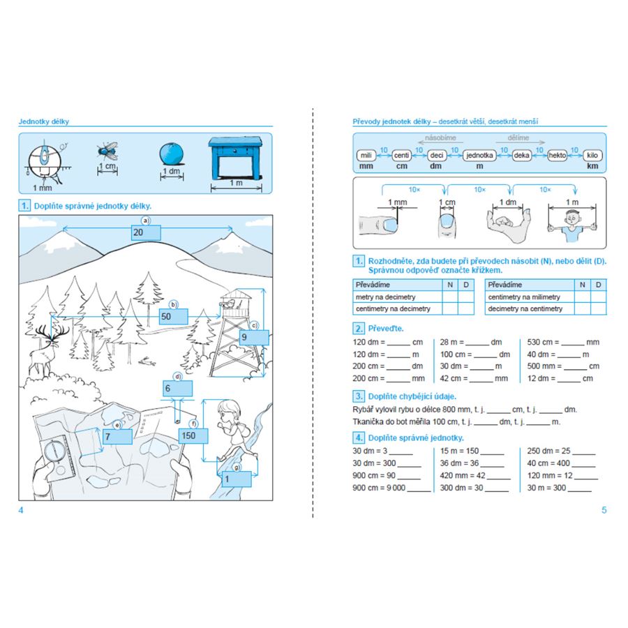 Tento dvoubarevný pracovní sešit nabízí jednoduchý postup pochopení systému převodů jednotek. Žáci se učí převádět jednotky logicky, v převodech hledají systém, například s pomocí osy převodů.
