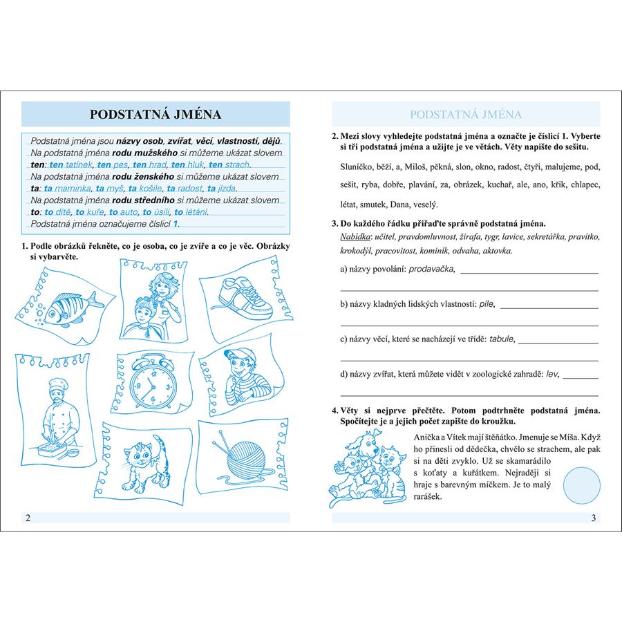 Nový dvoubarevný pracovní sešit procvičuje postupně všechny slovní druhy a na závěr je zařazeno opakování slovních druhů. Pracovní sešit obsahuje klíč s řešením.