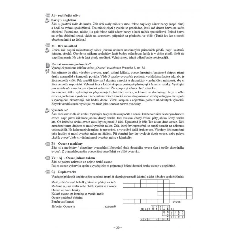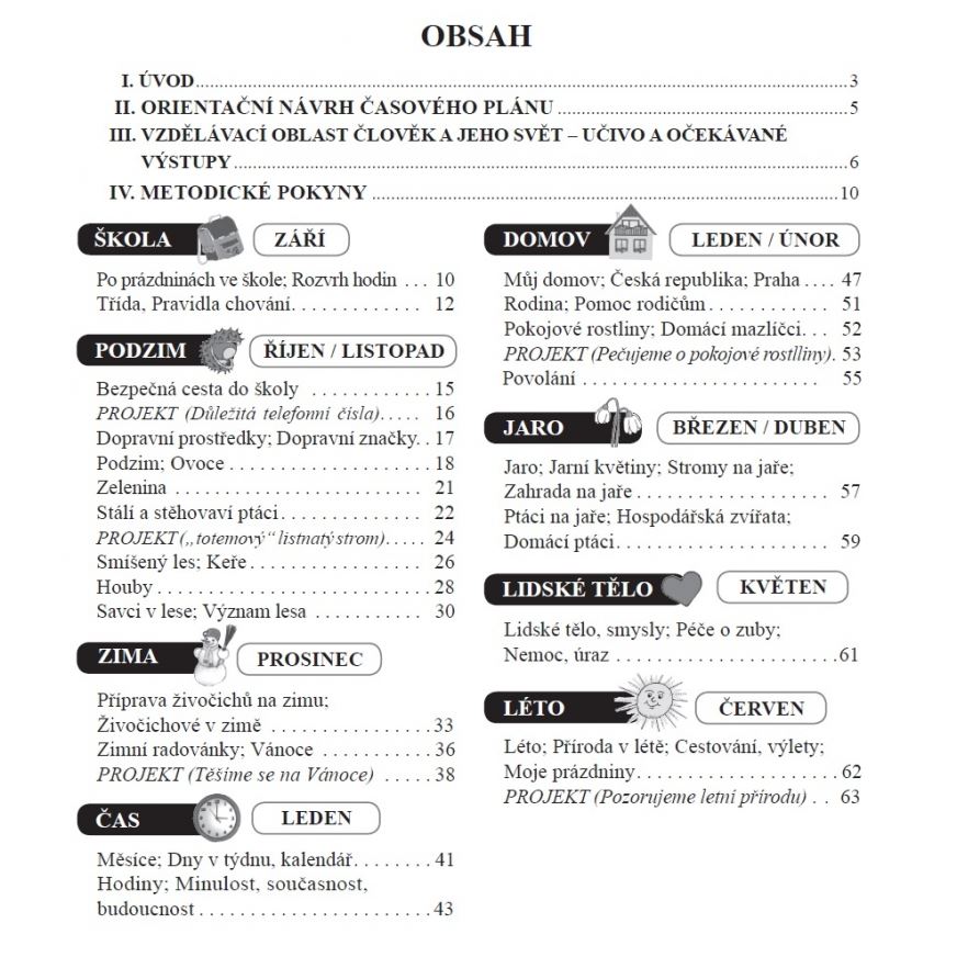 Obsahuje přehledně zpracované očekávané výstupy a návrh časového rozvržení učiva. Přináší popis, jak pracovat s učebnicí a s pracovním sešitem včetně odkazů na interaktivní učebnici IUč Prvouka 2. Součástí jsou náměty pro další činnost v hodinách. Zaměření úkolů je odlišeno ikonami a je provázáno s učebnicí a pracovním sešitem. Každé téma je uvedeno motivačním textem – básničkou, říkadlem, hádankou, úryvkem z dětské prózy. Motivační otázky prověřují porozumění textu a rozvíjejí komunikativní dovednosti na základě vlastních zkušeností žáků. Následuje společné opakování probraného učiva formou stručných kontaktních otázek nebo her. Další náměty na činnosti jsou zaměřeny na ztvárnění modelových situací, na hry, soutěže, jednoduché pokusy, náměty na pozorování v přírodě, mezipředmětové a skupinové úkoly.