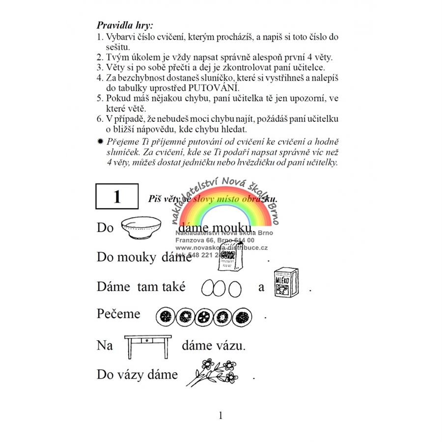 Formou zábavných cvičení založených na vědomostech dětí probírá učivo mluvnice z 1. pololetí – pojmy věta, slovo, slabika apod. Motivačním prvkem jsou vystřihovací sluníčka, která žáci za odměnu nalepují do sešitu.