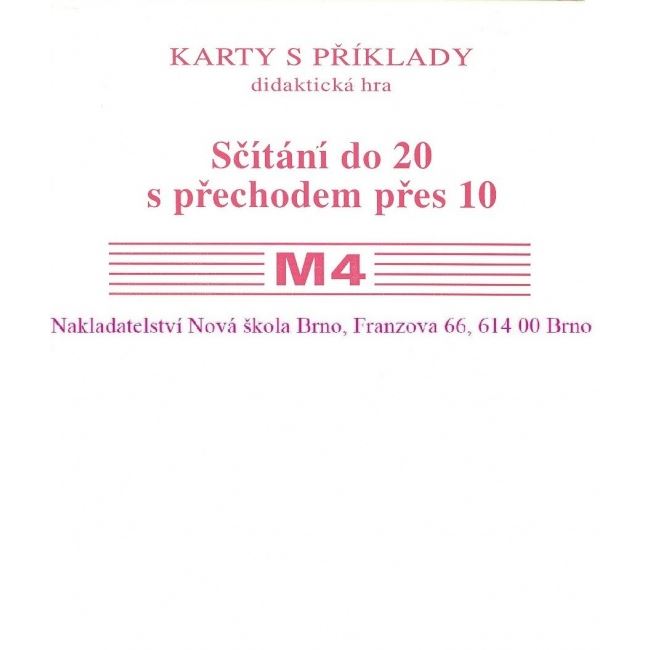 Sčítání do 20 s přechodem přes 10. Karty s příklady - didaktická pomůcka, slouží k procvičování početních výkonů ve vyučování, na pomoc škole hrou. Umožňují velmi dobré procvičování pamětného počítání. Vedou žáky k soustředění a pozornosti. Pomáhají k zautomatizování početních spojů. Jsou vhodné pro skupinovou práci, činnost ve dvojicích i k individuálnímu procvičení učiva. Soubor obsahuje příklady a jejich výsledky spolu s návodem k možnému využití karet při hře.