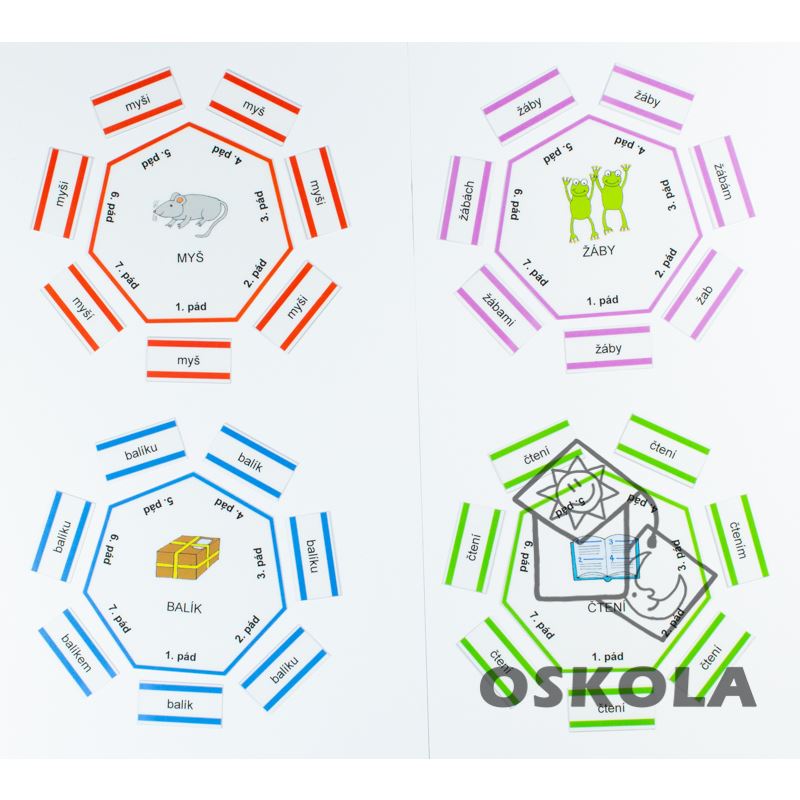 Kartičky jsou určeny pro děti mladšího školního věku k trénování skloňování podstatných jmen a rozlišování všech sedmi pádů.