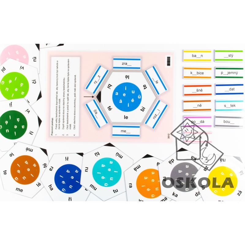 Balení obsahuje zalaminovanou podložku, 12 šestiúhelníků ve 12ti různých barvách a 12 x 6 slov. Úkolem je umístit slova okolo šestiúhelníku na správná místa. Po otočení kartiček si může dítě samo úkol zkontrolovat.
