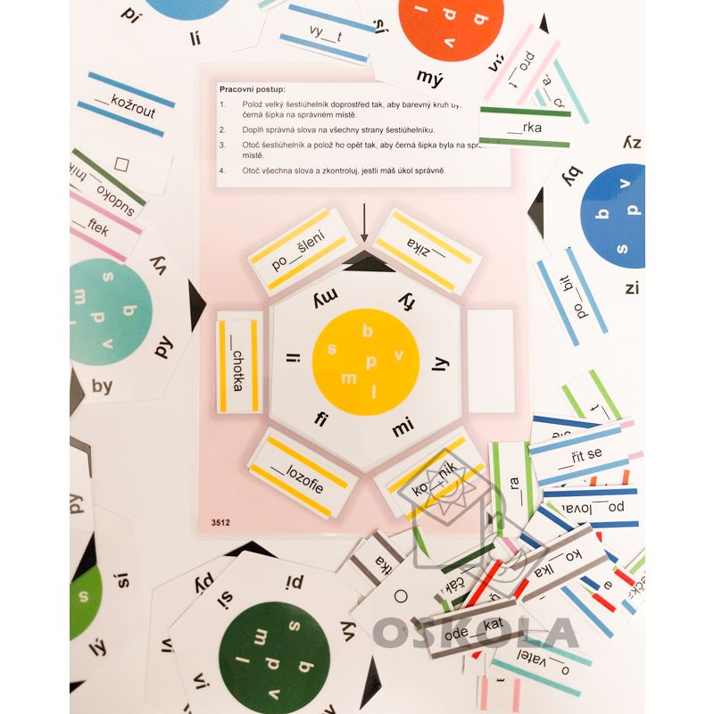 Kartičky se šestiúhelníky jsou výborným nástrojem pro podporu vývoje dovedností dětí mladšího školního věku. Každý balíček obsahuje zalaminovanou podložku a 12 šestiúhelníků v různých barvách. Každý šestiúhelník je zaměřen na specifické fonetické nebo gramatické prvky jazyka. Děti mohou cvičit rozlišování znělých a neznělých souhlásek, správného tvaru slov s příponami bě/bje, vě/vje, mě/mně nebo se vypracovat ve vyjmenovaných slovech. Úkolem je umístit slova kolem šestiúhelníku na správná místa. Po otočení kartiček si dítě může samo úkol zkontrolovat.