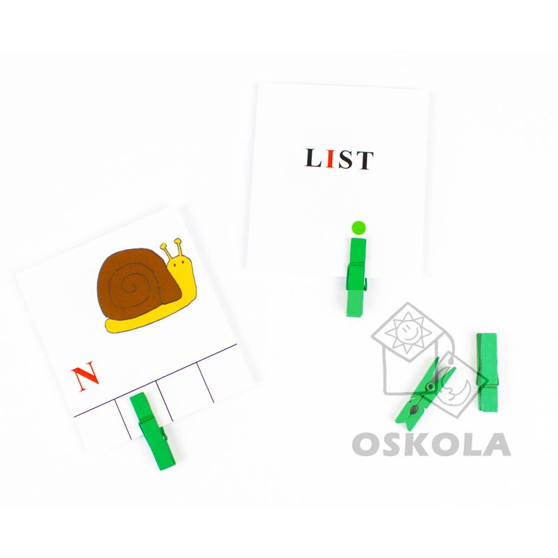 Každá sada obsahuje 24 kartiček. Na kartičce je obrázek, prázdná políčka podle počtu písmenek ve slově a jedno písmenko. Dítě má za úkol rozložit slovo na jednotlivé hlásky—písmena a umístit kolíček na takovou pozici, aby odpovídala poloze zobrazeného písmenka. Například ve slově MED a zvýrazněném písmenu D, musí dítě umístit kolíček na třetí pozici. Rozložení slov na jednotlivé hlásky je důležitým předpokladem pro správné psaní.