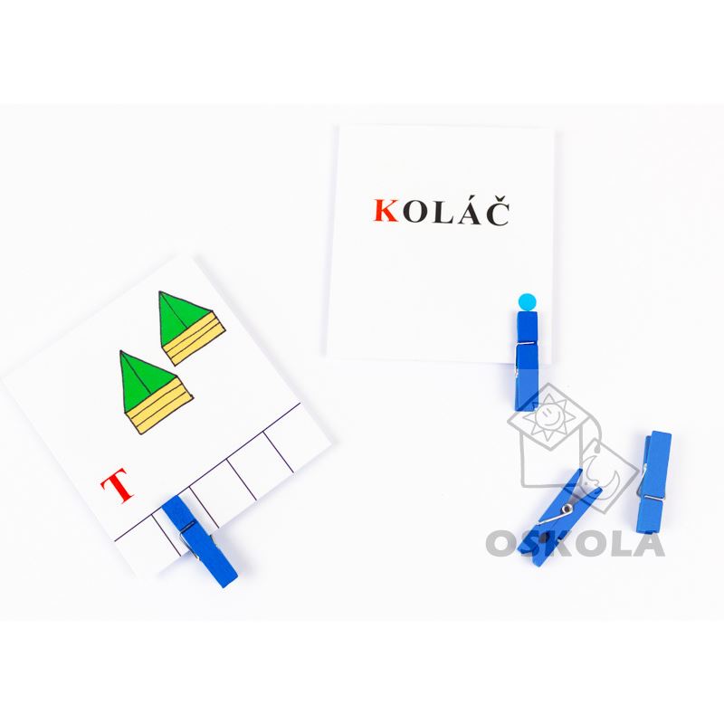 Každá sada obsahuje 24 kartiček. Na kartičce je obrázek, prázdná políčka podle počtu písmenek ve slově a jedno písmenko. Dítě má za úkol rozložit slovo na jednotlivé hlásky—písmena a umístit kolíček na takovou pozici, aby odpovídala poloze zobrazeného písmenka. Například ve slově MED a zvýrazněném písmenu D, musí dítě umístit kolíček na třetí pozici. Rozložení slov na jednotlivé hlásky je důležitým předpokladem pro správné psaní.