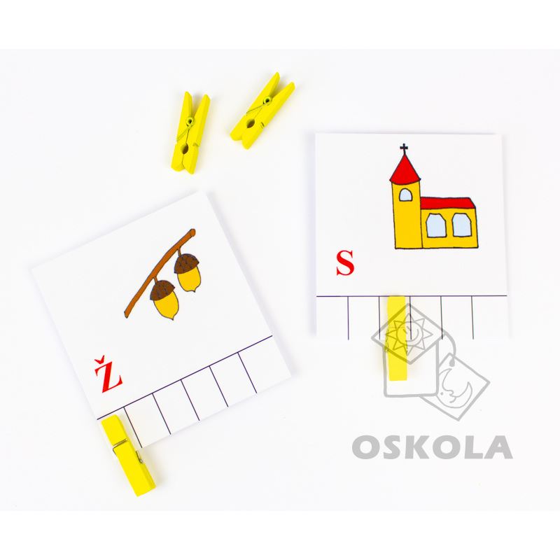 Každá sada obsahuje 24 kartiček. Na kartičce je obrázek, prázdná políčka podle počtu písmenek ve slově a jedno písmenko. Dítě má za úkol rozložit slovo na jednotlivé hlásky—písmena a umístit kolíček na takovou pozici, aby odpovídala poloze zobrazeného písmenka. Například ve slově MED a zvýrazněném písmenu D, musí dítě umístit kolíček na třetí pozici. Rozložení slov na jednotlivé hlásky je důležitým předpokladem pro správné psaní.