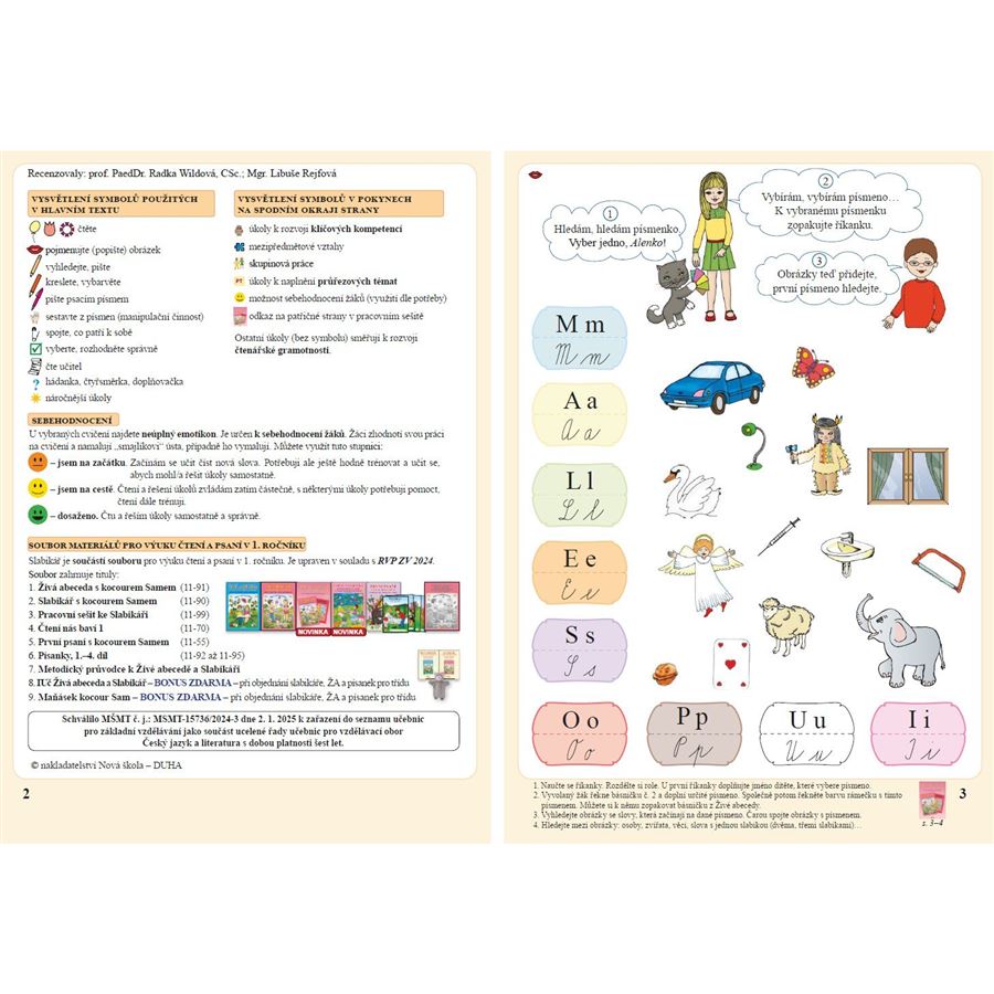 Učebnice přímo navazuje na Živou abecedu s kocourem Samem. Průvodní postavou je i zde kocour Sam, který doprovází Alenku a Michala. Kocour Sam opět odměňuje děti sluníčky.