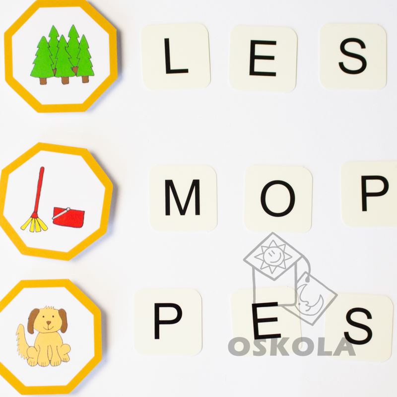 Osmiúhelníkové obrázky a kartičky s písmenky pomáhají dětem rozvíjet schopnost skládat slova.