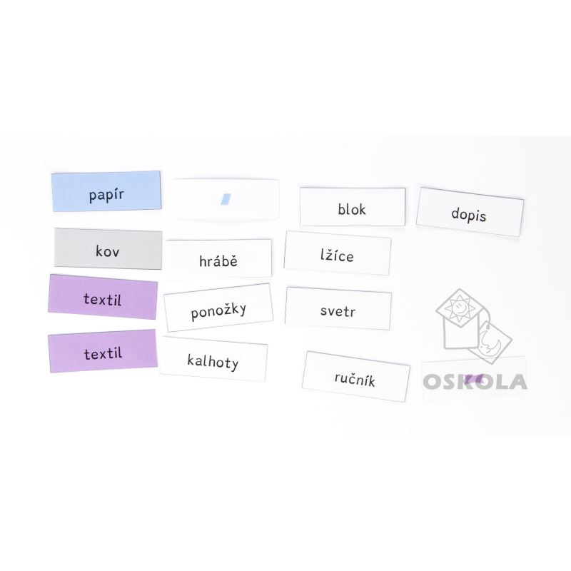 V balení najdete 4 nadřazené pojmy: kov, textil, papír, dřevo. Úkolem dítěte je, přiřadit k nadřazeným pojmům pojmy podřazené. Pomůcka vhodná k rozšíření slovní zásoby a trénování čtení s porozuměním. Dítě si může výsledek samostatně zkontrolovat.