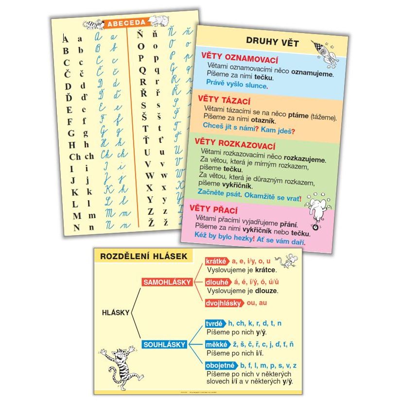 Obsahuje tabule: Rozdělení hlásek; Druhy vět; Abeceda (tiskací a psací písmo) - oboustranné zpracování tabule Abeceda přináší obě varianty malého psacího "z". Nové grafické zpracování, na barevném podkladu.