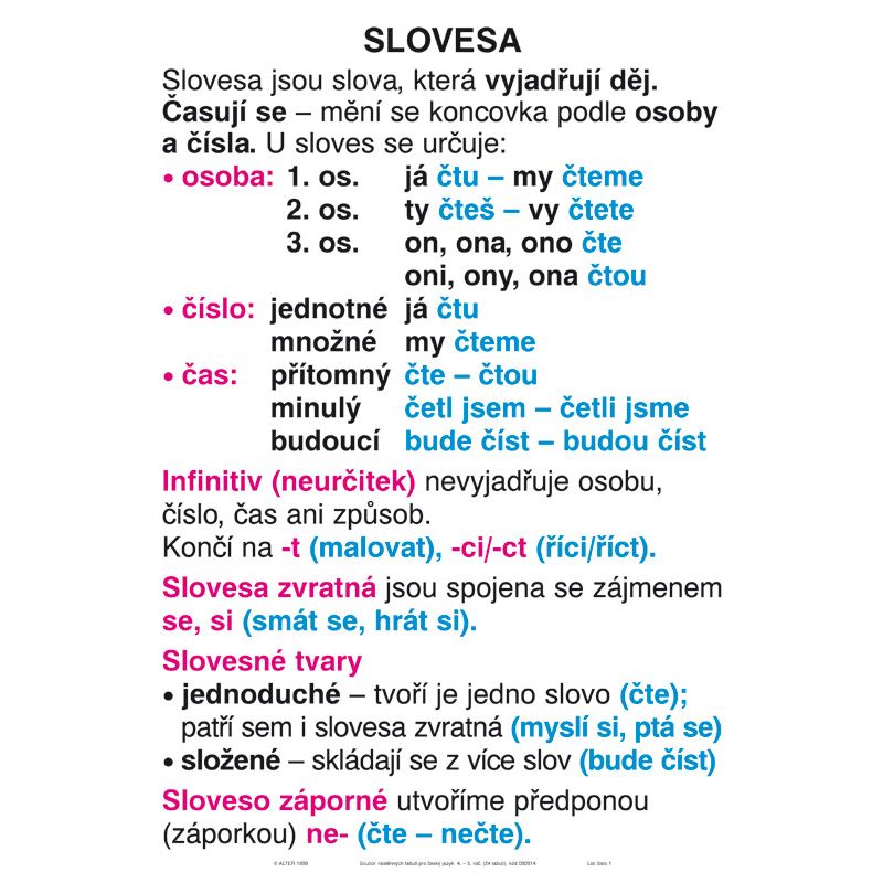 Obsahuje 24 trojbarevných tabulí: Slovesa; Časování sloves ve způsobu oznamovacím;