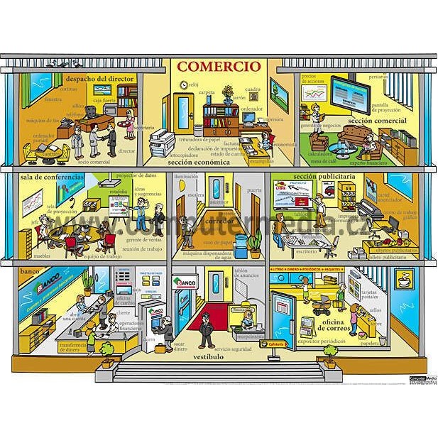 Špičkově ilustrovaný barevný velkoplošný obraz kompletně ve španělském jazyce, tematicky zaměřený na obchod, reklamu, jednání, bankovní prostředí a poštu. Z pohledu slovní zásoby se jedná o mírně náročnější obraz.