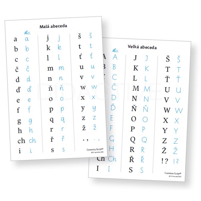 Praktická pomůcka s tištěnou a psací abecedou Comenia Script opatřená matnou laminací.