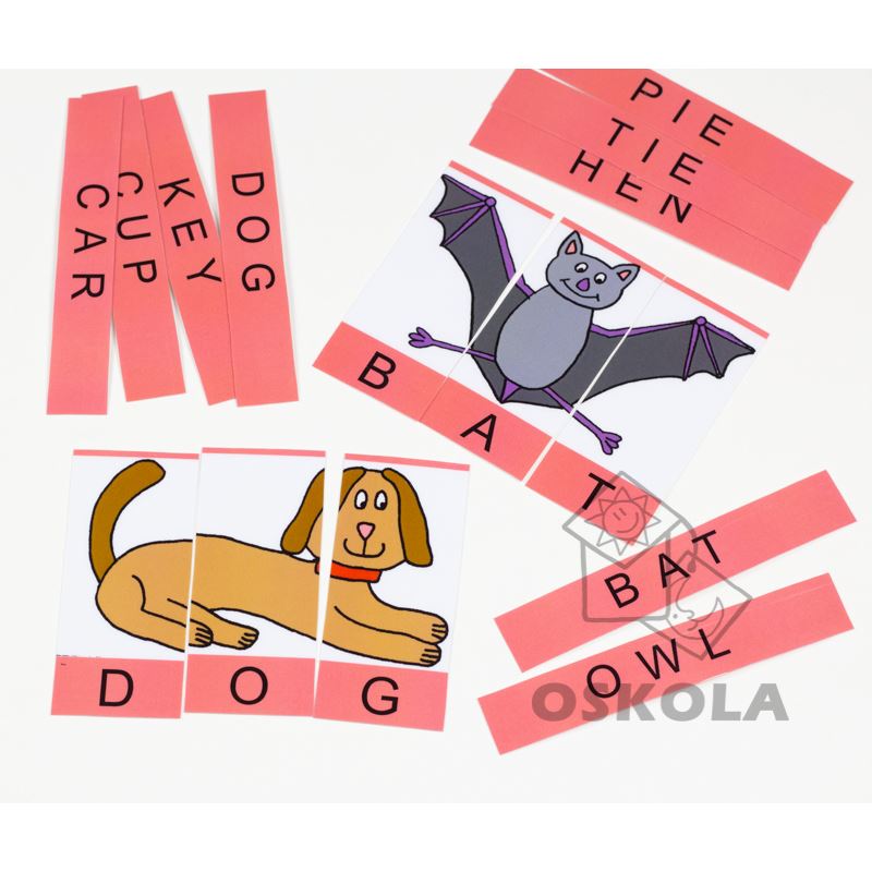 Skládačka obsahuje 15 obrázků, každý se skládá ze tří částí - tří písmenek. Slova jsou v anglickém jazyce. Dále obsahuje proužky se slovy ke každému obrázku. Celkem obsahuje 60 dílků.