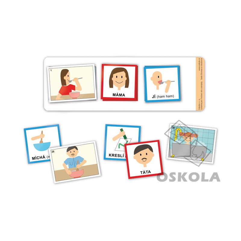 Sada kartiček „Tvoření vět s obrázky – Slovesa“ je určena pro děti předškolního věku a děti s poruchami řeči. Pomáhá rozvíjet gramatické dovednosti, tvorbu vět a větných struktur. Sada obsahuje různé kartičky, které dětem umožňují sestavovat jednoduché věty z podstatných jmen, sloves a osob. Díky vizuálnímu zpracování a citoslovcům, které jsou součástí sloves, je tato pomůcka vhodná i pro děti, které se teprve učí mluvit. Kartičky jsou také ideální pro děti s autismem nebo lehkým mentálním postižením.