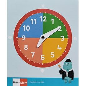 Praktické papírové výukové hodiny s mechanickými ručičkami. Na zadní straně schéma měsíců a ročních období.