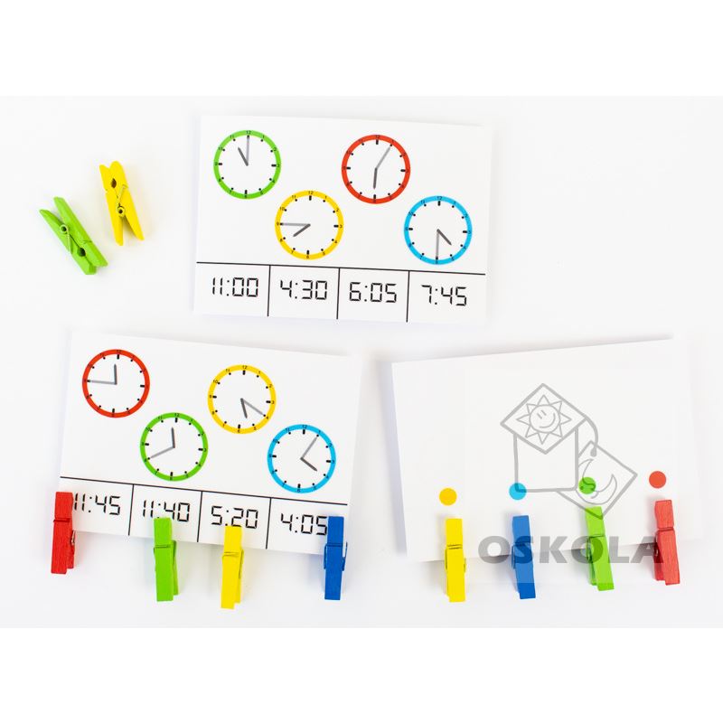 Sada obsahuje 20 kartiček, na každé kartičce jsou 4 různobarevné ciferníky s ručičkovými hodinami. Úkolem je určit čas zobrazený na hodinách a správnou odpověď označit na spodní části kartičky dřevěným kolíčkem příslušné barvy.