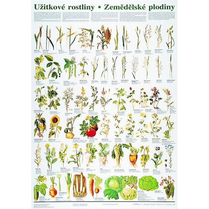 Znalost kulturních rostlin, co všechno pěstujeme na zahrádkách i na polích, je potřebná od školního věku. Tato nástěnná tabule přehledně zobrazuje všechny základní zemědělské plodiny.