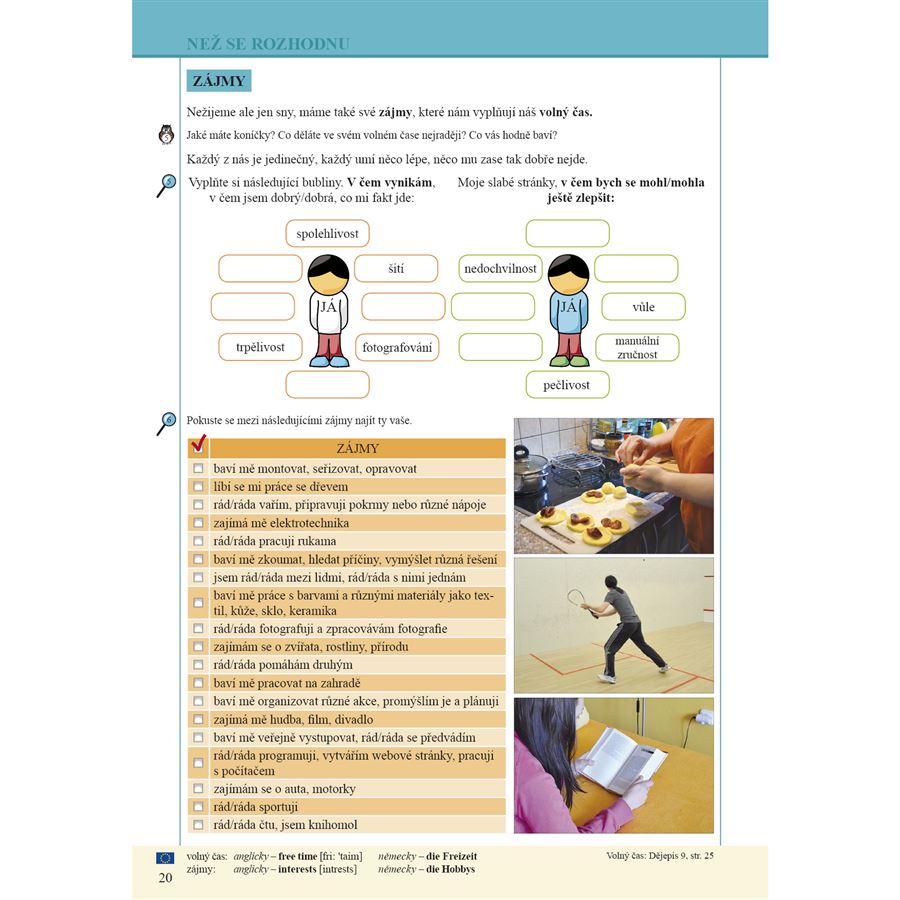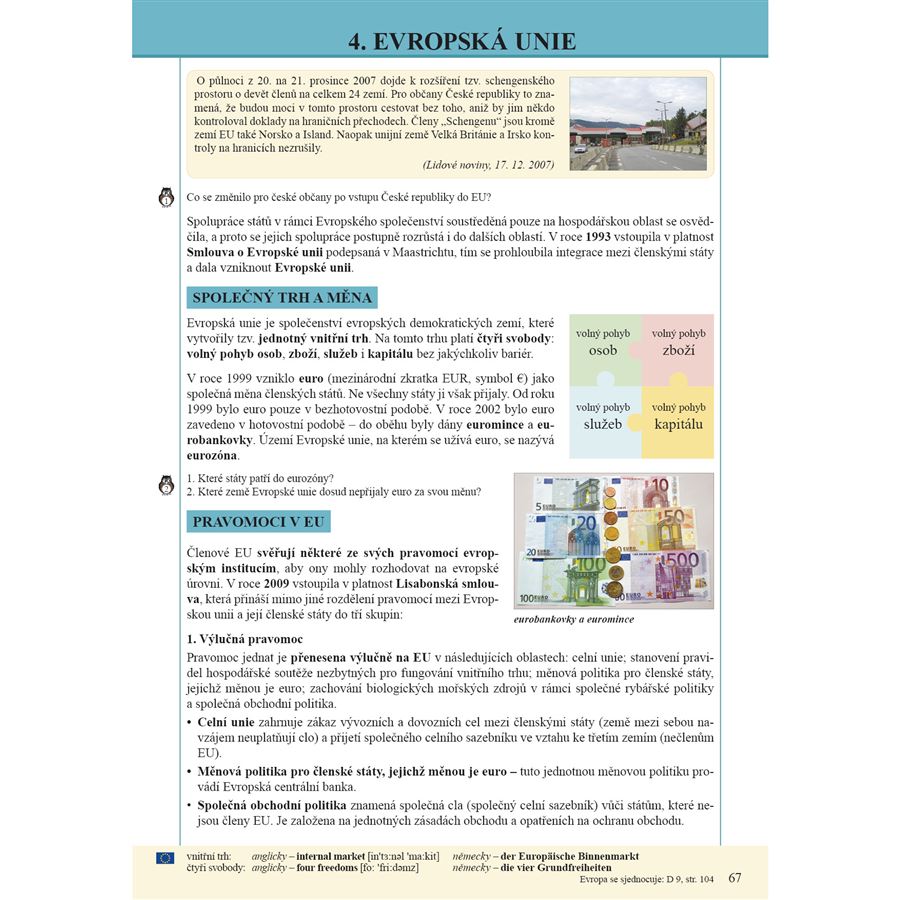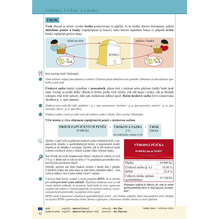 V 1. kapitole se žáci seznámí s jednotlivými náboženstvími (judaismus, křesťanství, islám, hinduismus, buddhismus). Zařazena jsou i témata náboženské tolerance, nová náboženská hnutí, extremismus a fanatismus. Druhá kapitola obsahuje volbu povolání, volbu SŠ a nástup do zaměstnání. Kapitola Finanční gramotnost seznamuje s penězi, formami placení, platební kartou. Jsou zde i podkapitoly Hospodaření domácnosti, Trh výrobků a služeb a především Úspory, úvěry a úroky, kde jsou připraveny názorná schémata a příklady. Kapitola Národní hospodářství vysvětluje pojmy tržní a centrálně plánovaná ekonomika, HDP, nezaměstnanost, inflace, vývoz a dovoz, státní rozpočet a daně. Aktuální články v úvodu kapitol vedou k rozvoji pochopení textu, čtení a získávání informací z grafů a tabulek. V poslední kapitole se žáci seznámí s mezinárodními organizacemi, kterých je ČR členem.
