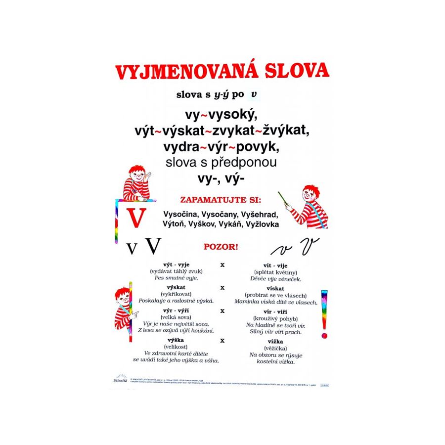 Oboustranná výuková tabules vyjmenovanými slovy po V, která kromě základních vyjmenovaných slov přináší i některé pravopisné odlišnosti a na druhé straně tabule je 36 krátkých slovních spojení na doplňování y-ý nebo i-í po souhlásce V.