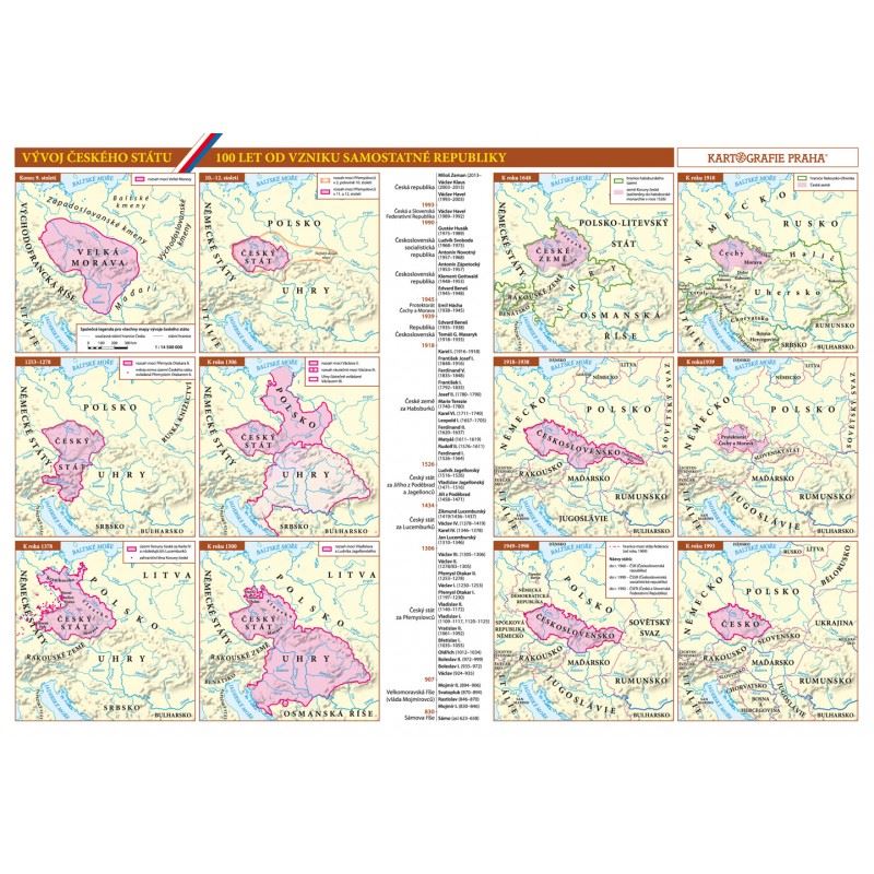 Ke stoletému výročí od vzniku Republiky Československé jsme připravili originální příruční mapu. Lícová strana na 12 mapkách zobrazuje postupný vývoj státních útvarů na našem území, od období Velké Moravy, přes Český stát za Přemyslovců a Lucemburků, Habsburskou monarchii, První republiku až po současné Česko. Mapy jsou navíc doplněny přehlednou časovou osou s výčtem všech panovníků a prezidentů. Rubová strana mapy pak zobrazuje současné Česko se všemi významnými řekami, pohořími, nížinami a vrcholy, ale taky se základní sítí silnic a železnic, hranicemi krajů a velkými i menšími městy a obcemi.