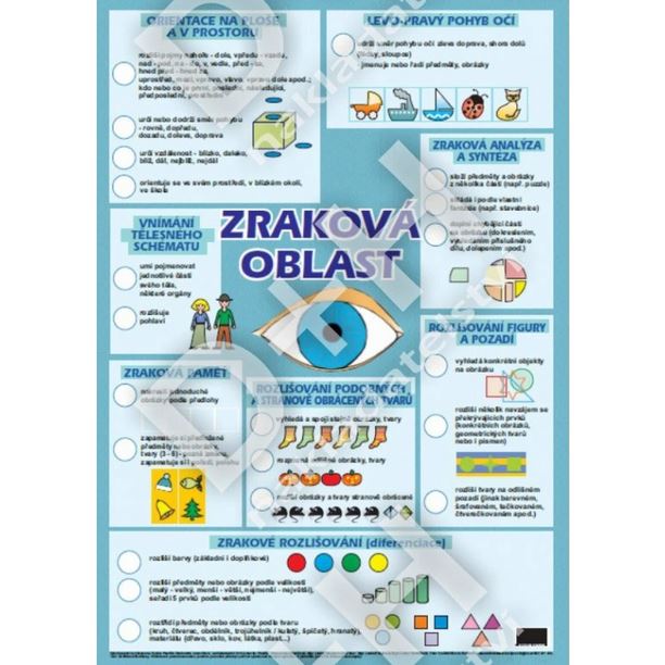 Jedná se o sadu pěti plakátů formátu A2 s částečně vizualizovaným souhrnem dovedností k jednotlivým oblastem (zrakové, sluchové, poznávací, motorické a sociální). Povrch je polaminovaný - proto lze plakáty využívat různým způsobem (označováním dosažených dovedností dokreslováním nebo dolepováním samolepek, některé úkoly lze řešit přímo na plakátech - např. ve zrakové oblasti). Součástí je i metodický list.