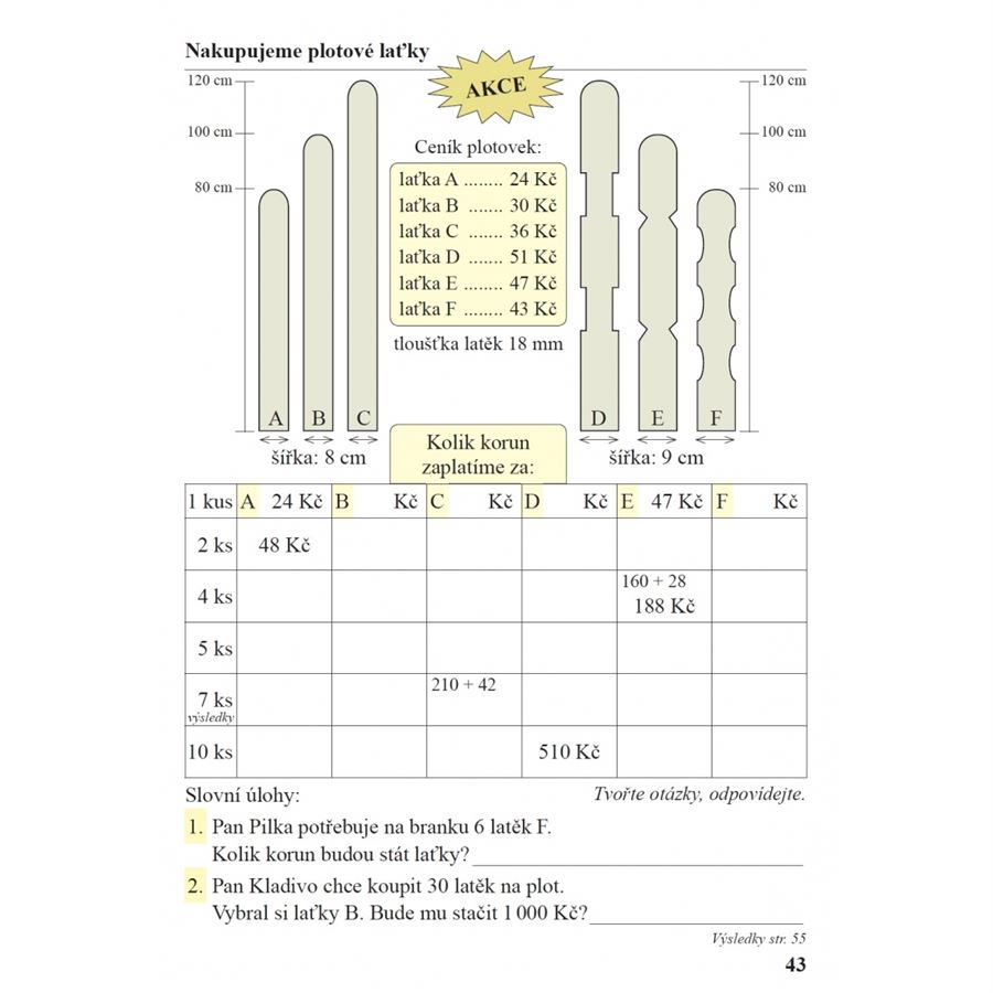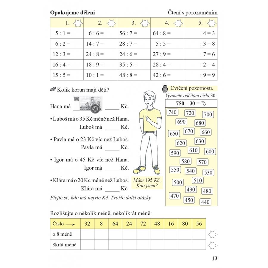 K procvičování numerace v rozšířeném číselném oboru a číselných představ, je do sešitu zařazována číselná osa. Učivo zlomků je procvičováno na základě zobrazených nákresů. Obsahuje rozhodovací úlohy (A, B, C, D) stejně jako v mezinárodních testech. V sešitu se systematicky procvičují početní výkony pamětně i písemně.