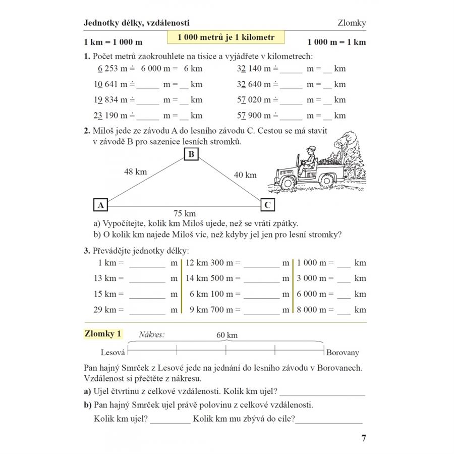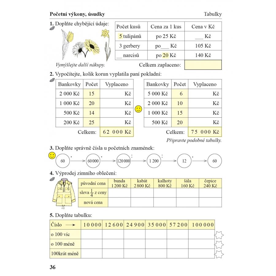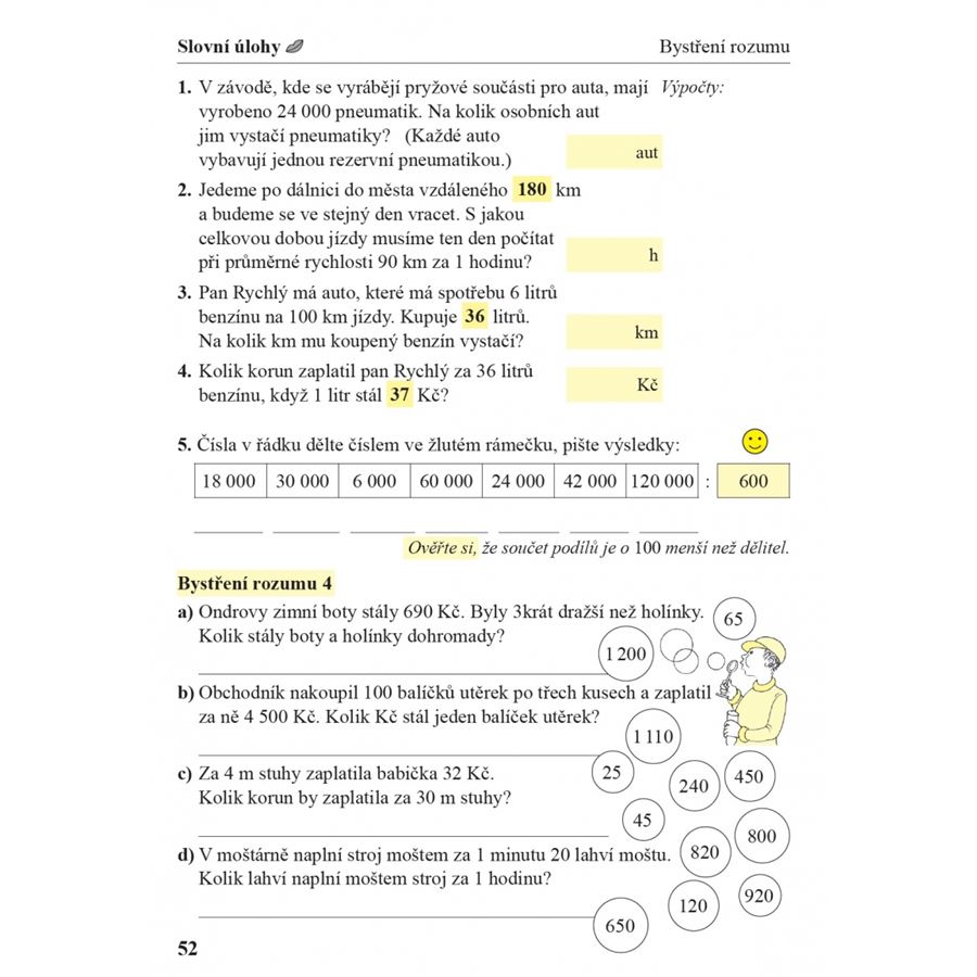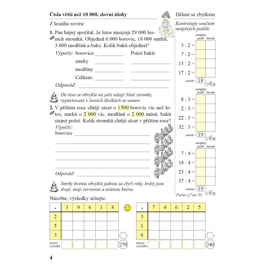 V sešitu žáci procvičují a zároveň bodově hodnotí svoje počtářské dovednosti. Ve slovních úlohách jsou vedeni k rozlišování úsudků, k jednoduchým zápisům i odpovědím. Ve spojení s obrázky a nákresy jsou procvičovány zlomky. V sešitu jsou též stránky označené Zajímavé počítání, Bystření rozumu. Pozornost je věnována i učivu geometrie. Mezipředmětové vztahy se vážou k přírodovědě i k historii.