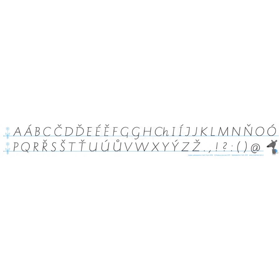 Proužek tužšího papíru velikosti 297 x 40mm. Na jedné straně jsou velká písmena a vybrané znaky, na straně druhé pak malá písmena (včetně diakritiky), číslice a znaky € a &. Vhodné pro 2. třídu. U znaků nejsou uvedeny tahy.