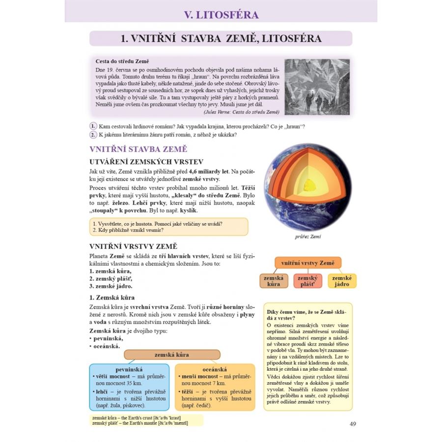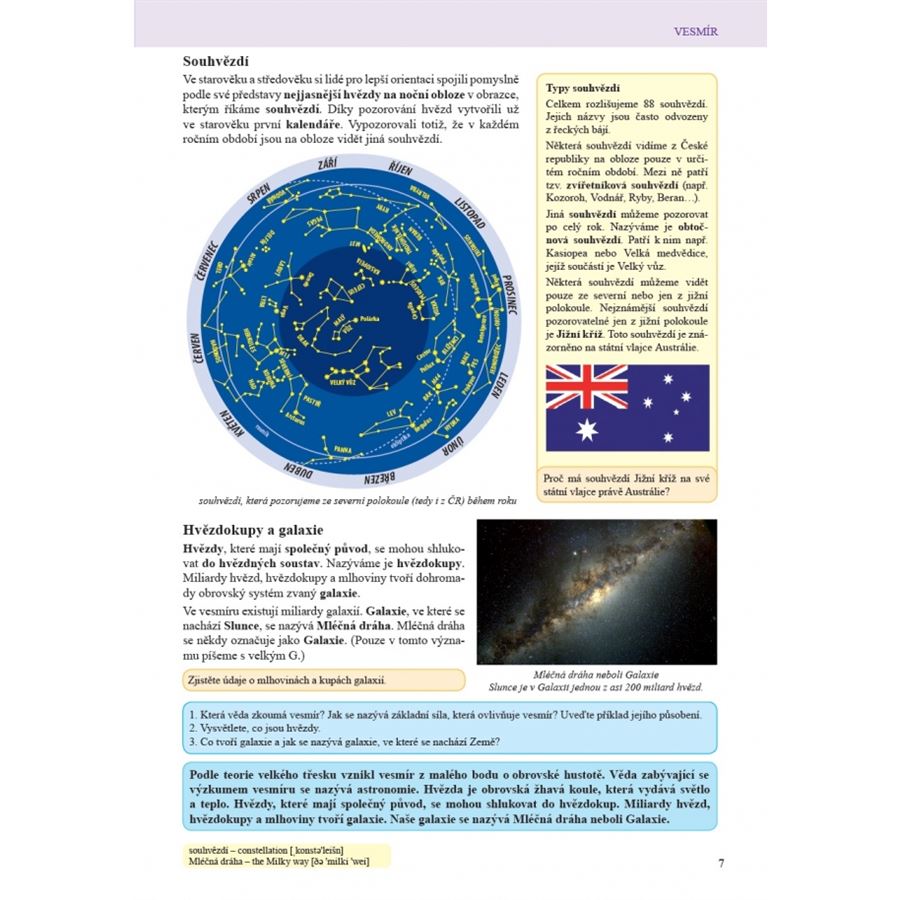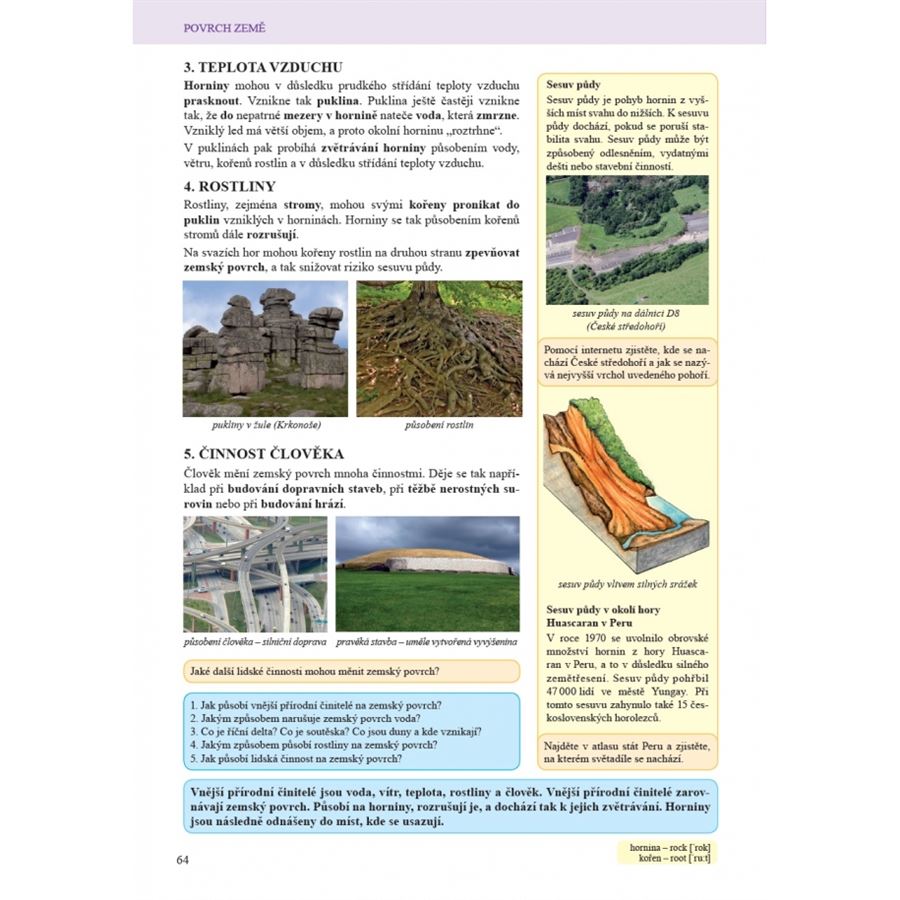 Důraz je kladen na názornost, srozumitelnost, logické souvislosti a mezipředmětové vztahy. Texty jsou přehledně členěny do tematických kapitol. Kapitola začíná vždy na nové straně. Učební text je psán přehledně a jednoduše s ohledem na věk žáků. Součástí jsou i ukázky krásné literatury a související otázky na porozumění textu. Každá větší kapitola je zakončena opakováním. Učebnice obsahuje mnoho názorných fotografií, obrázky a schémata. Díky nim žáci pochopí lépe učivo. Text doplňuje velké množství map. Základní text je doplněn zajímavostmi, které jsou uvedeny po okrajích učebnice. V zajímavostech najdete i medailonky významných osobností ze světa vědy. Právě tyto zajímavosti, přehledné obrázky a mapy motivují žáky k učení. Učebnici doplňuje interaktivní učebnice, která kromě cvičení obsahuje také videa a mapy.