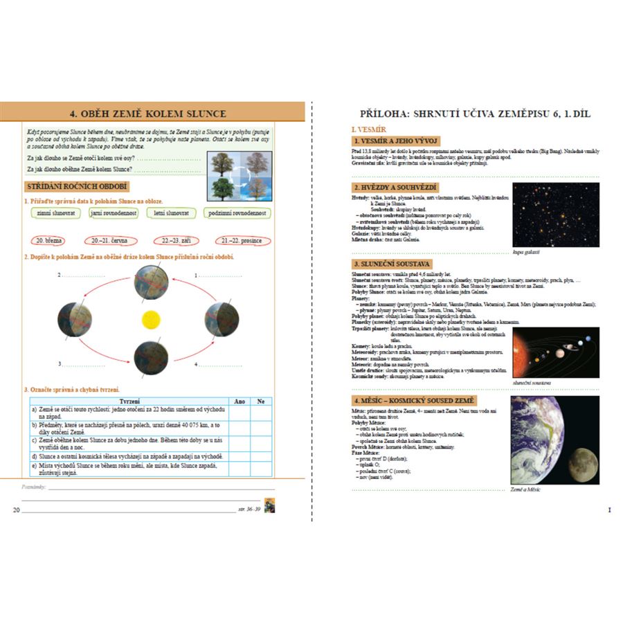 Nový barevný pracovní sešit tvoří funkční celek s učebnicí Zeměpis 6, 1. díl. Je součástí ucelené řady učebnic a pracovních sešitů zeměpisu, která klade důraz na provázanost učiva a jeho praktickou využitelnost a je vytvořena v souladu s RVP ZV. Pracovní sešit obsahuje především úkoly k pochopení a upevňování učiva. Tento sešit je možné využít místo vlastního sešitu žáka, jsou zde procvičeny všechny základní pojmy z učebnice. V úvodu každé kapitoly je krátký text, který má nejen edukační, ale i motivační funkci. Pochopení textu a navazující úkol rozvíjejí čtenářskou gramotnost, stejně jako řada úkolů pracovních sešitů, které vycházejí z porozumění textu uvedeného v učebnici. Jednotlivé celky jsou uzavřeny souhrnným opakováním a sebehodnoticí tabulkou. Úkoly v pracovních sešitech podporují rozvoj zeměpisné gramotnosti. Na každé straně sešitu jsou uvedeny odkazy na konkrétní strany v učebnici. Na volné řádky umístěné ve spodní části stran si žáci mohou zapisovat své poznámky k danému tématu. Vyplněné úkoly a cvičení si mohou žáci procházet, a tak si látku opakovat.