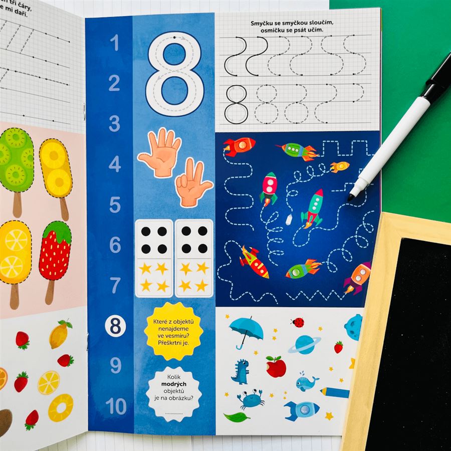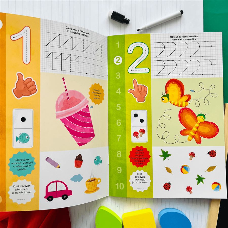 Každá strana je věnovaná konkrétnímu číslu (1 – 10) a doplňujícím úkolům zaměřené na logiku a poznávání barev (Kolik zelených objektů je na obrázku? Co si vezmeš, když venku prší? Zakroužkuj.).