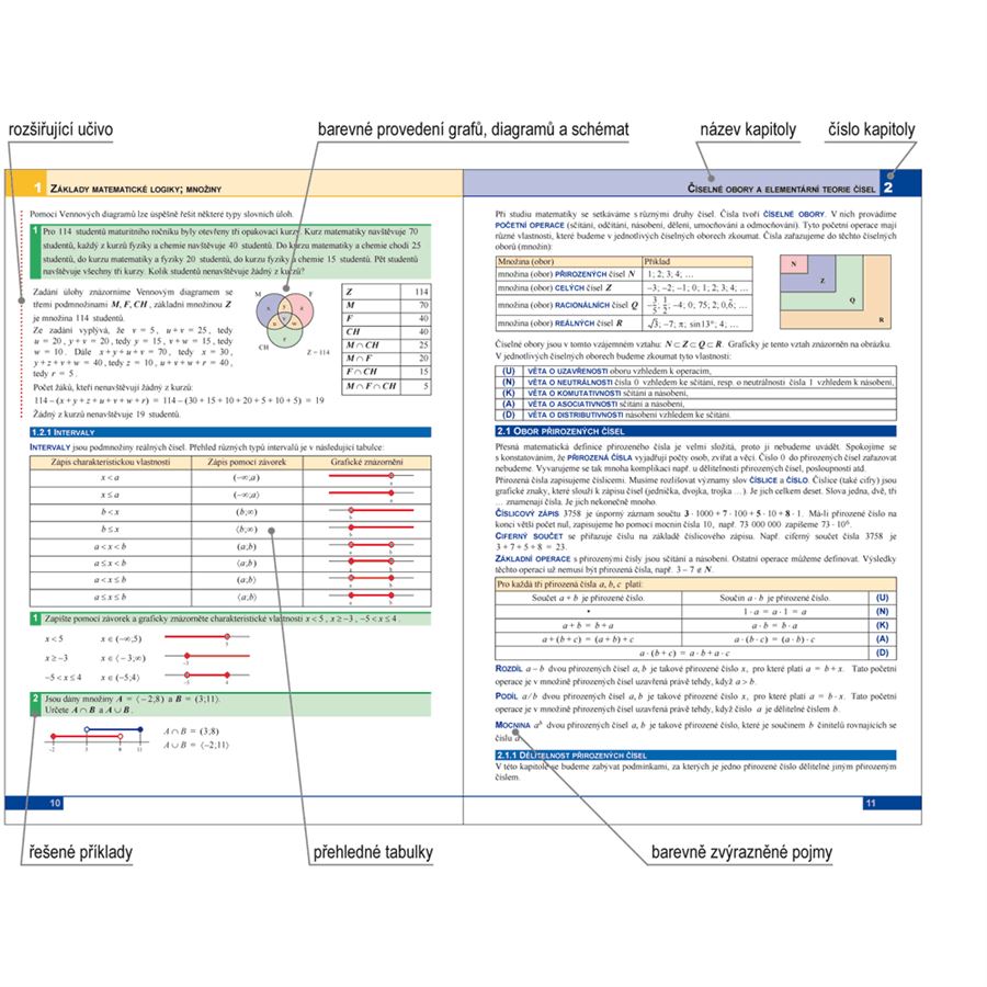 Učebnice obsahuje celou středoškolskou látku matematiky: • Základy matematické logiky • Množiny • Číselné obory a elementární teorie čísel • Algebraické výrazy • Mocniny a odmocniny • Rovnice a nerovnice • Funkce • Goniometrické funkce a trigonometrie • Planimetrie • Stereometrie • Komplexní čísla • Analytická geometrie • Posloupnosti a řady • Kombinatorika • Pravděpodobnost • Statistika. Nechybí však ani doporučené rozšiřující učivo pro přípravu studentů na vysokoškolské studium matematicko-přírodovědných, technických, ekonomických a dalších směrů, v nichž je dobrá připravenost studentů v matematice požadována: • Diferenciální a integrální počet • Úvod do finanční matematiky. Pochopení učiva usnadňují řešené příklady. K přehlednosti knihy přispívá barevné provedení grafů, diagramů, schémat a tabulek.