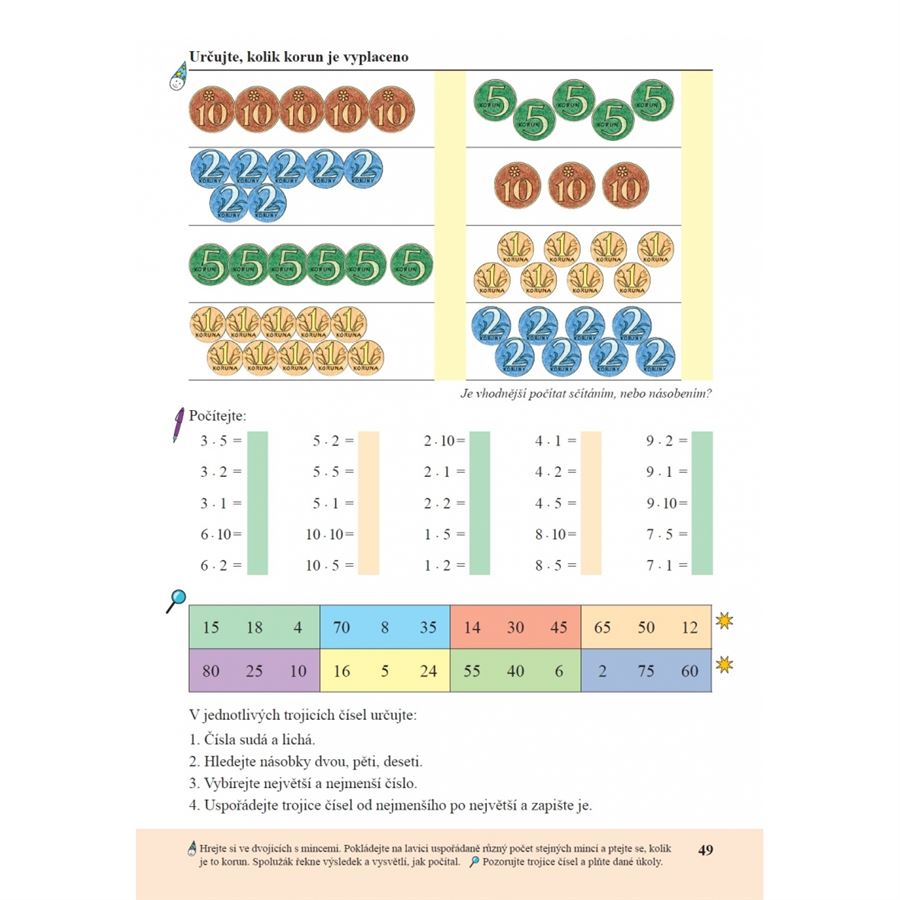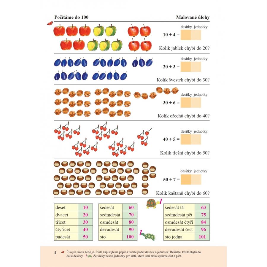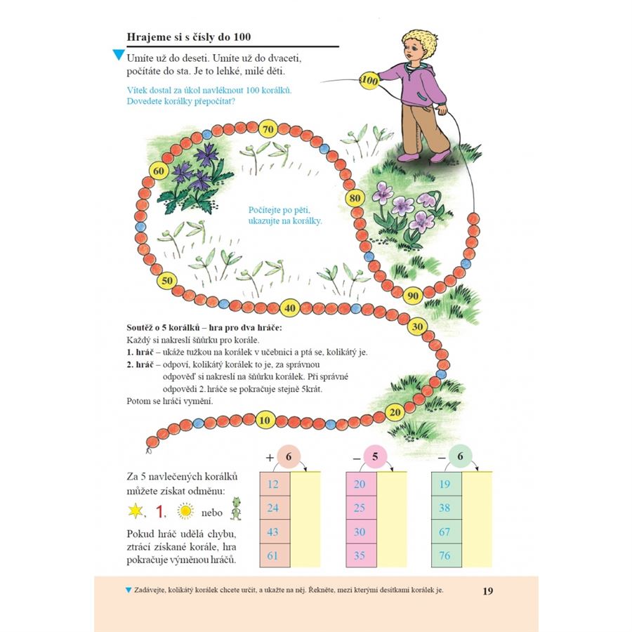 K žákovským činnostem učebnice názorně předkládá pomůcku Desítky koleček, důležitou při počítání do 100. Učebnice uvádí také násobilku 1, 2, 5, 10 a 4 a její odvození i prvopočáteční procvičování s názorem.