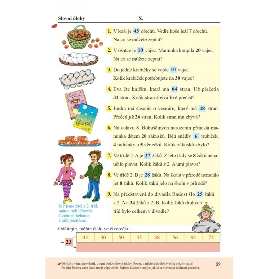 Učebnice se v dostatečné míře věnuje správnému určování jednotek a desítek v číslech z oboru do 100. Ve slovních úlohách se pozornost zaměřuje na rozlišování úsudků – o několik více, o několik méně.