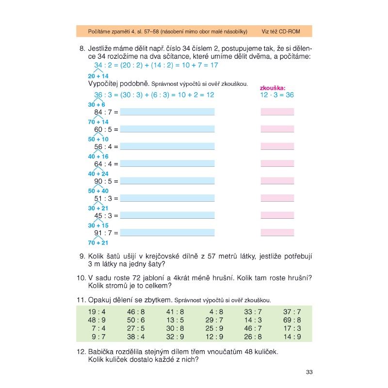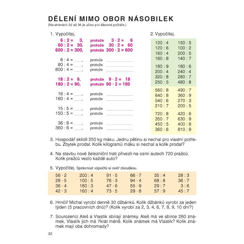 Učebnice probírá dělení se zbytkem, násobení a dělení mimo obor násobilek.