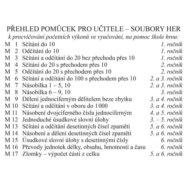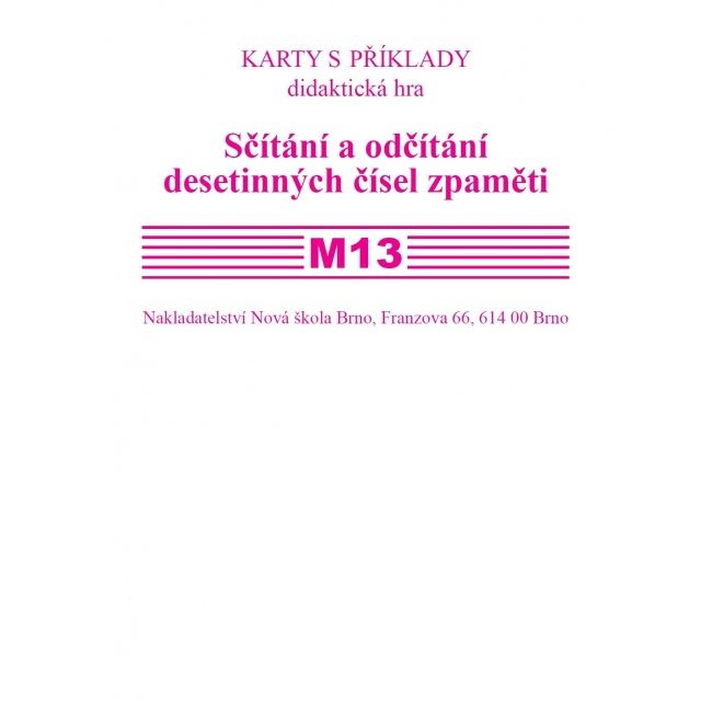 Určeno na sčítání a odčítání desetinných čísel zpaměti, určeno pro žáky 5. a 6. ročníku. Karty s příklady - didaktická pomůcka, slouží k procvičování početních výkonů ve vyučování, na pomoc škole hrou. Umožňují velmi dobré procvičování pamětného počítání. Vedou žáky k soustředění a pozornosti. Pomáhají k zautomatizování početních spojů. Jsou vhodné pro skupinovou práci, činnost ve dvojicích i k individuálnímu procvičení učiva. Soubor obsahuje příklady a jejich výsledky spolu s návodem k možnému využití karet při hře.
